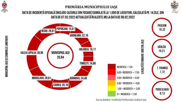 Rata de incidenţă a cazurilor noi cumulată la 14 zile, la nivelul judeţului Iaşi, este de 13,98 la mia de locuitori (față de 13,87 la mie înregistrată cu o zi în urmă).