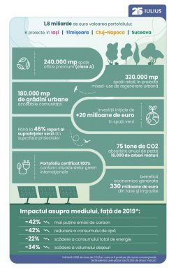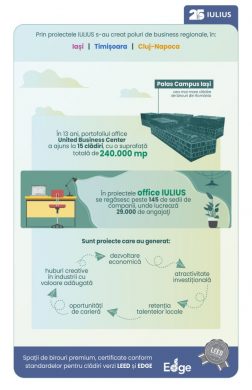 Anul acesta, compania IULIUS aniversează 25 de ani de la inaugurarea primului proiect real-estate modern și marchează un moment definitoriu în evoluția dezvoltării urbane în Iași, Timișoara și Cluj-Napoca, subliniind impactul major al portofoliului său de clădiri office asupra economiei locale. Sub brandul United Business Center (UBC), IULIUS a transformat centrele acestor orașe în adevărate huburi de business, prin dezvoltarea a 240.000 mp de spații office premium, integrate în proiecte mixte. Comunitatea UBC a ajuns la 145 sedii de companii, multinaționale și naționale, din domenii cu plus-valoare, unde lucrează 29.000 de angajați. Tot compania IULIUS a inaugurat la Iași, în 2023, Palas Campus, cea mai mare clădire de birouri din România (60.000 mp). Mai multe despre rețeaua office pot fi aflate aici (https://www.youtube.com/watch?v=IUNKvdyWMZU&t=1s).