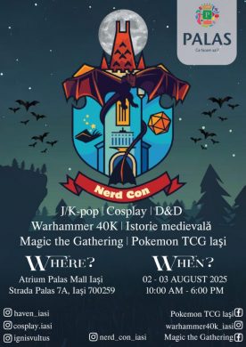 Weekendul acesta, Atriumul Palas se transformă în universul geek&pop culture, cu personaje din lumile fantasy, cu costume create de imaginația fără limite a culturii japoneze și cu vibe de sărbătoare. NerdCon te invită într-o incursiune pe tărâmuri populate de elfi, dragoni și personaje din jocuri video sau anime-uri, un show al duelurilor cu zaruri norocoase, Cosplays, sincroane și ritmuri muzicale energice. Cei mici se bucură de încă un spectacol cu trucuri de magie, oferit de Alex Magicianul.