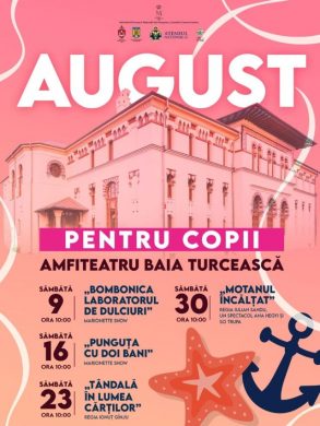 Primele două weekenduri din august aduc în prim-plan Trupa Marionnette Show, care va prezenta pe 9 august spectacolul Bombonica – Laboratorul de dulciuri iar pe 16 august, clasica poveste Punguța cu doi bani, reinterpretată cu umor și creativitate. Programul continuă pe 23 august cu Tândală în lumea cărților în regia lui Ionuț Gînju – o producție care încurajează lectura și imaginația iar pe 30 august, So Trupa și Ana Hegyi urcă pe scenă cu spectacolul Motanul încălțat, în regia lui Iulian Sandu.