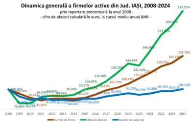Statistica are la bază indicatorii economici raportați la Finanțe de firmele ieșene, prin bilanțurile aferente anului 2024 și oferă inclusiv o perspectivă interesantă a evoluției începând cu anul 2008 și până în 2024. De menționat faptul că statistica elaborată se referă strict la societățile comerciale locale, deci cele înregistrate cu sediul social pe raza județului Iași, care au depus bilanț până în luna iulie.