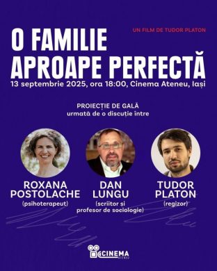 Cinema Ateneu Iași va găzdui pe 13 septembrie, de la ora 18:00, proiecția specială a filmului „O familie aproape perfectă”, regizat de Tudor Platon, urmată de o discuție cu Roxana Postolache (psihoterapeut) și Dan Lungu (scriitor și profesor de sociologie).