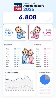 Potrivit datelor Direcţiei Locale de Evidenţă a Persoanelor (DLEP) Iaşi, în anul 2025 în Municipiul Iași au fost înregistrate 6.808 nașteri (3.517 băieți și 3.291 fete).