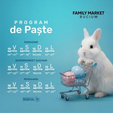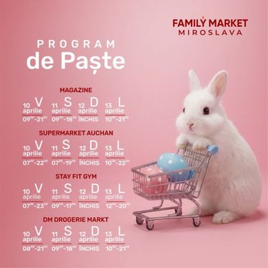Cele două proiecte Family Market din Miroslava și Bucium au, de asemenea, un program special în această perioadă. Vineri, 10 aprilie, magazinele funcționează între 09.00 și 21.00, iar sâmbătă între 09.00 și 18.00. Duminică, magazinele vor fi închise, însă luni programul va fi între 10.00 și 21.00. Auchan este deschis vineri, în ambele locații, în intervalul 07.00 – 22.00. Sâmbătă, supermarketurile se deschid la ora 07.00, însă la Family Market Bucium se închid la ora 18.00, iar la Miroslava la ora 19.00. Duminică, locațiile vor fi închise, iar luni vor funcționa între 10.00 și 22.00. McDrive-ul de la Family Market Bucium va fi deschis non-stop.