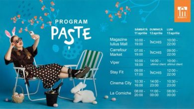 La Iulius Mall Iași, sâmbătă, 11 aprilie, magazinele sunt deschise între 10.00 și 19.00, iar duminică, 12 aprilie, vor fi închise. Luni, 13 aprilie, programul revine la normal, între 10.00 și 22.00. Carrefour Market va funcționa sâmbătă între 07.00 și 19.00, duminică va fi închis, iar luni va avea program între 09.00 și 22.00. Cinema City este deschis în toate aceste zile: sâmbătă, între 10.30 și 16.00, duminică între 14.00 și 23.00 și luni între 10.30 și 23.00. Alte locații, precum Stay Fit și restaurantele, vor avea program adaptat, care poate fi consultat pe paginile pe site-ul Iulius Mall Iași.