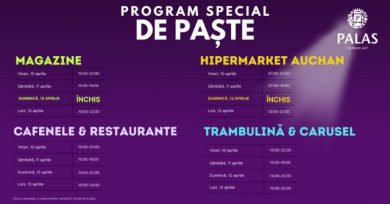 Trambulina și caruselul din Palas vor fi deschise sâmbătă, între 10.00 și 18.00, duminică între 14.00 și 22.00, iar luni vor funcționa conform programului normal, 10.00 – 22.00. Și cafenelele și restaurantele vor avea un program personalizat, care poate fi consultat pe pagina de Facebook a Palas.