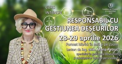 Camera de Comerţ şi Industrie Iaşi vă invită să participaţi la cursul intensiv ”Responsabil cu Gestiunea Deșeurilor”. Cursul va fi 100% interactiv și va fi susţinut, în perioada 28-29 aprilie 2026, orele 15.00-19.00, online pe platforma Zoom și în sală (Camera de Comerț Iași), de către dr. ing. chimist Maria Petruc, expert în legislația mediului, specialist cu o vastă experiență profesională în domeniul gestiunii deșeurilor și substanțelor chimice periculoase în cadrul Agenției pentru Protecția Mediului Iași.