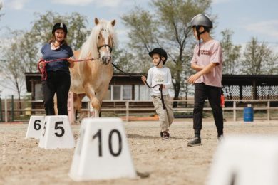Pe arena Clubului Equester din Iași, un copil și mama lui încearcă pentru prima dată să conducă un cal pe un traseu simplu, de la sol.